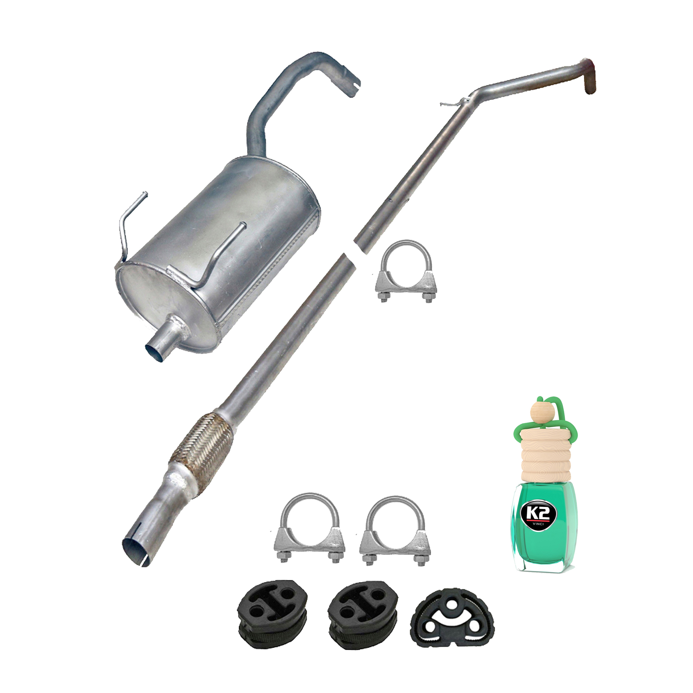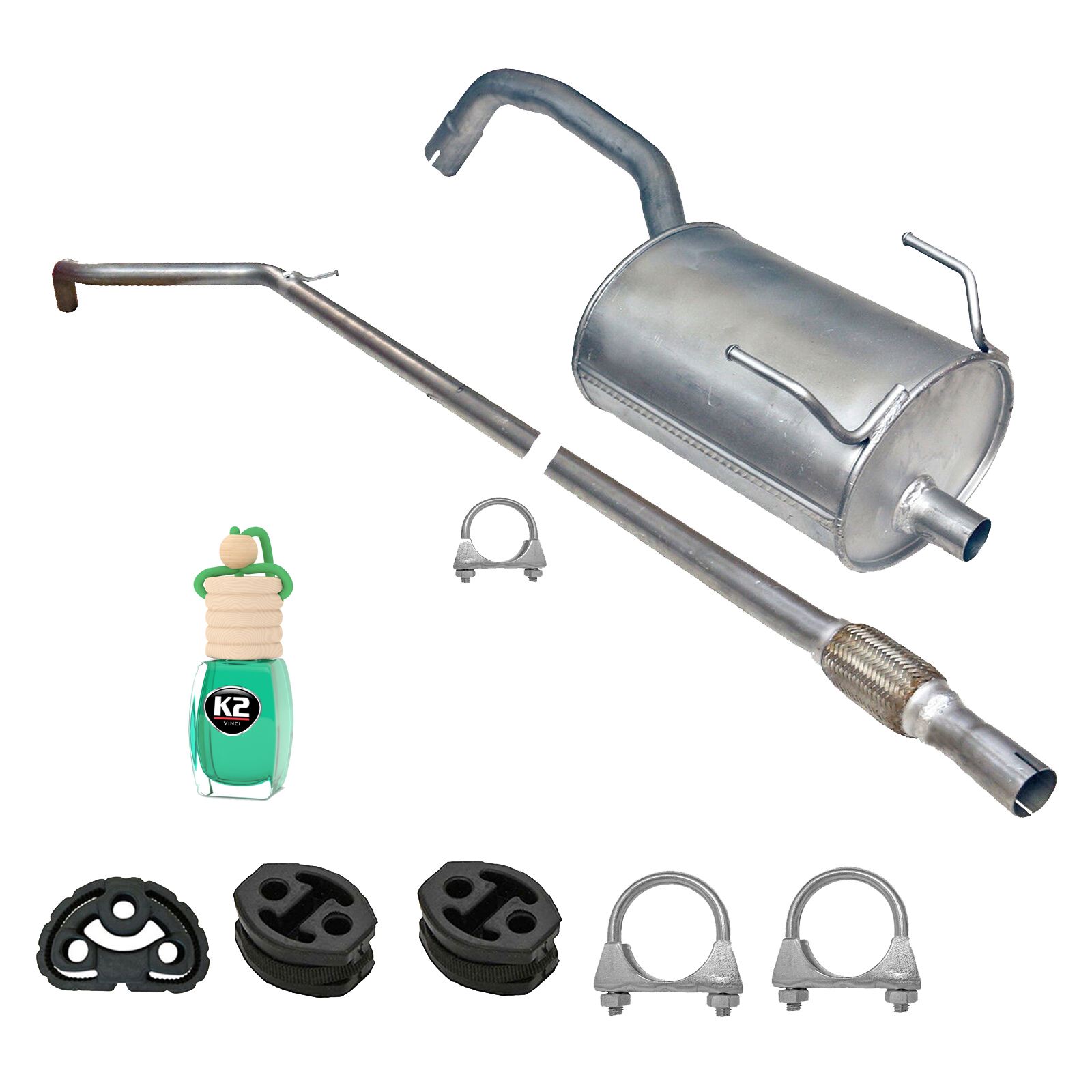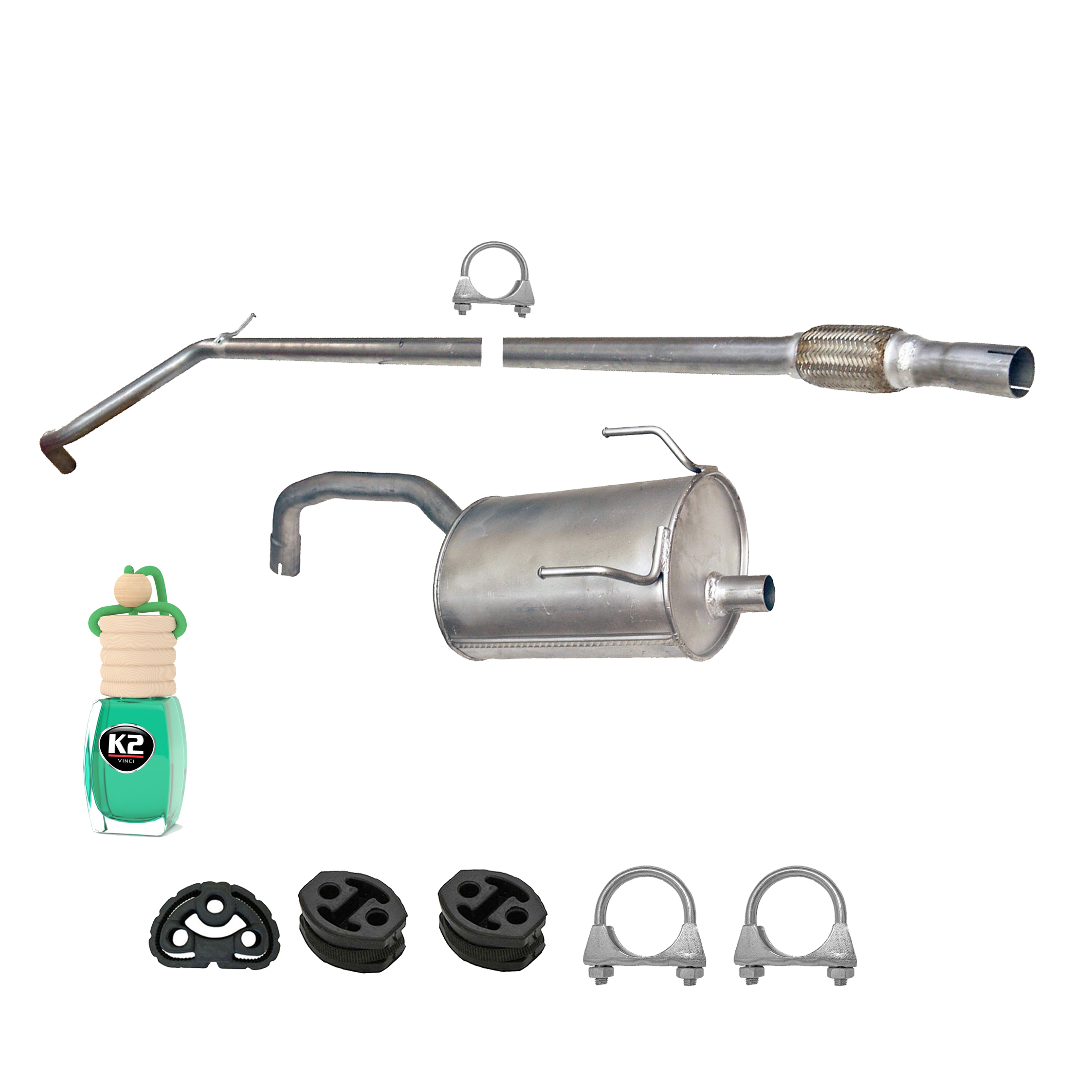 * Tłumiki posiadają system wygłuszający na bazie włókna szklanego dzięki temu nie zmienia się głośność układu wydechowego. * Produkt nie wymaga spawania !