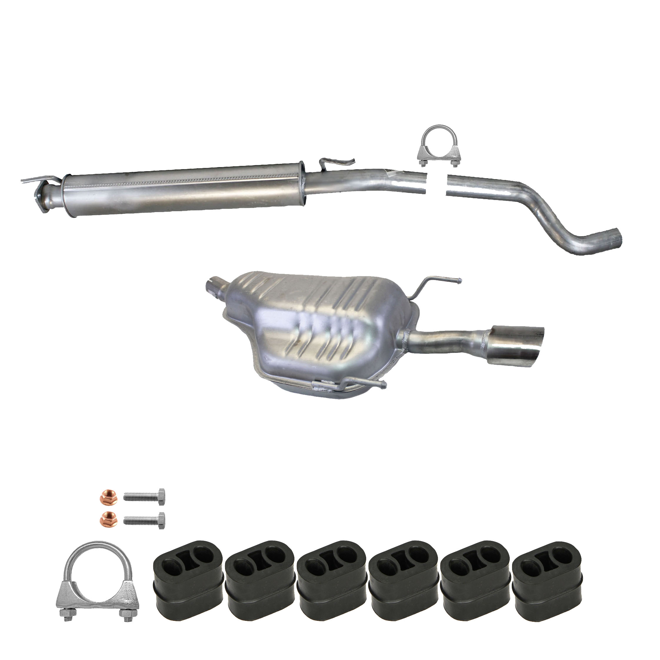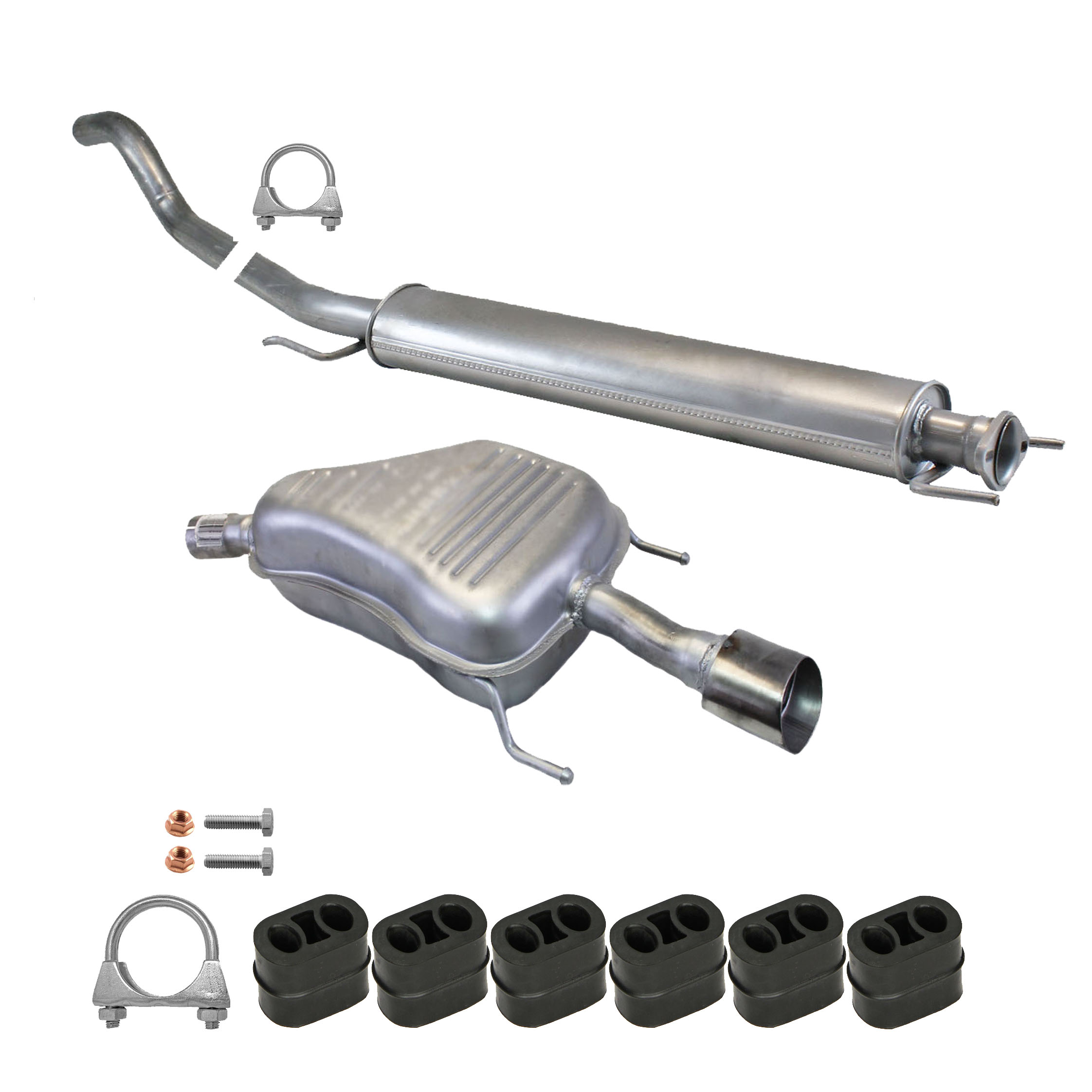 * Tłumiki posiadają system wygłuszający na bazie włókna szklanego dzięki temu nie zmienia się głośność układu wydechowego. * Produkt nie wymaga spawania !