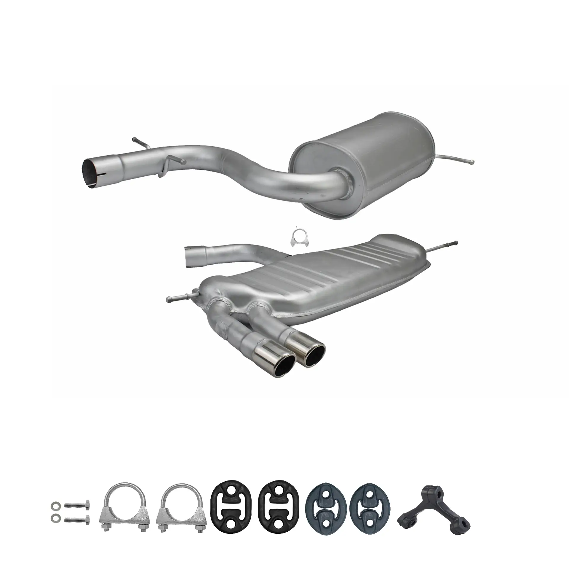 * Tłumiki posiadają system wygłuszający na bazie włókna szklanego dzięki temu nie zmienia się głośność układu wydechowego. * Produkt nie wymaga spawania !