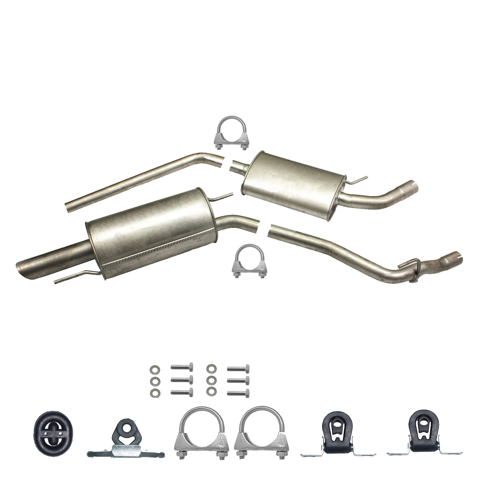 * Tłumiki posiadają system wygłuszający na bazie włókna szklanego dzięki temu nie zmienia się głośność układu wydechowego. * Produkt nie wymaga spawania !